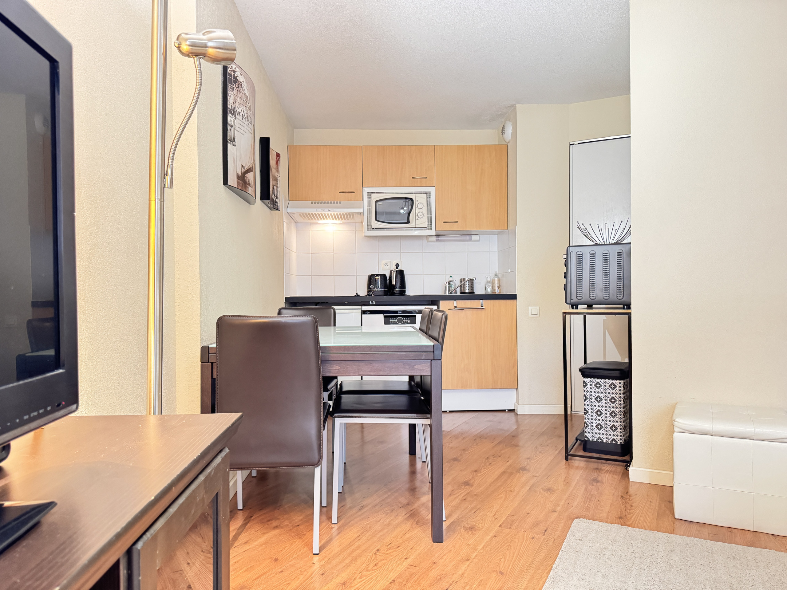 A living room with equipped kitchenette (hob, top fridge, dishwasher, microwave, mini oven, filter coffee maker and Nespresso, kettle, toaster, raclette grill). Dining table. Sofa and TV screen.