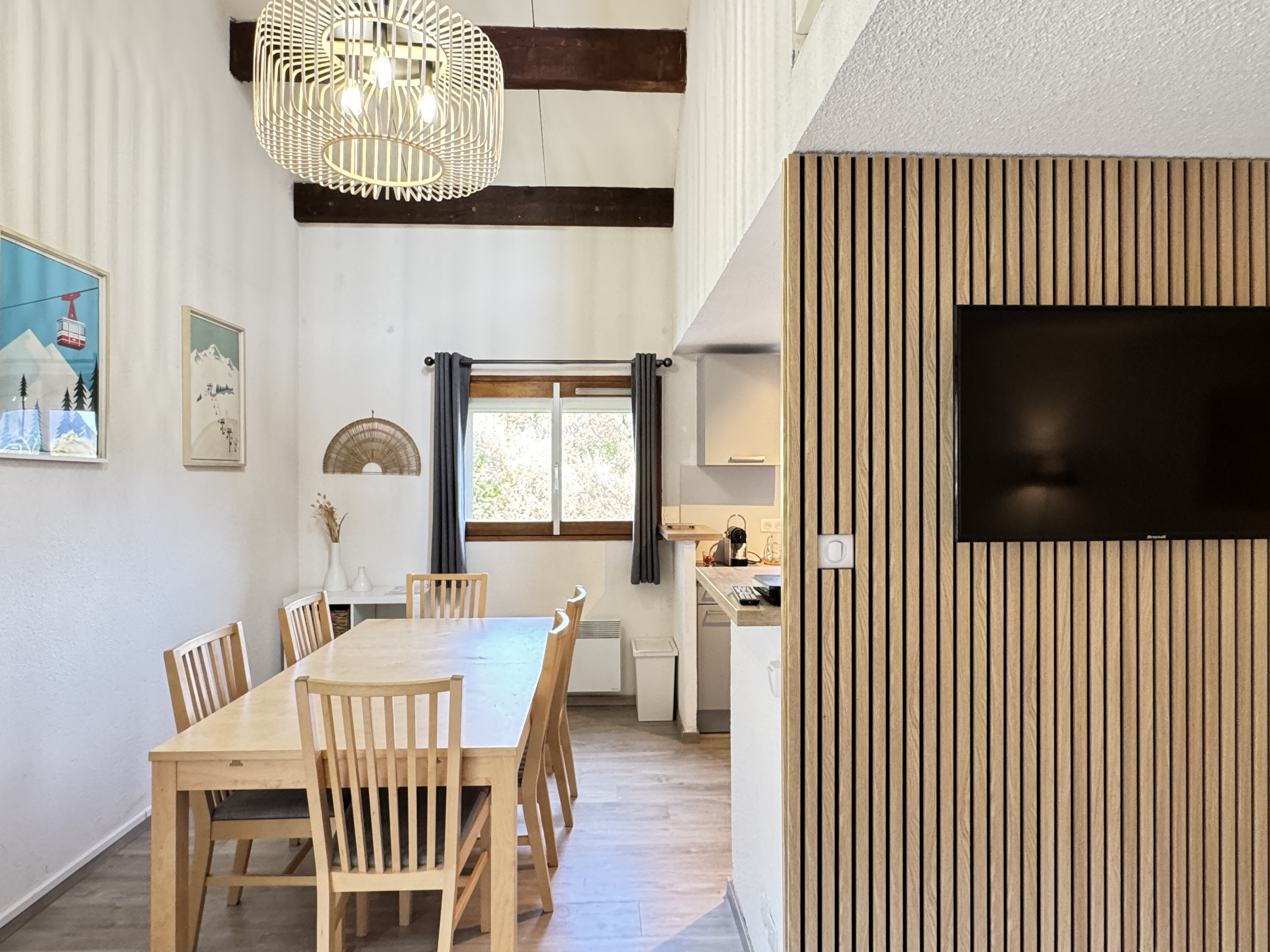 - Living room with sitting area (sofa bed 140x190, coffee table, TV screen), dining area (table seating 6), fully-equipped kitchenette (induction hob, fridge-freezer, combi oven, dishwasher, filter and Senséo coffee makers, toaster, kettle, raclette machine).