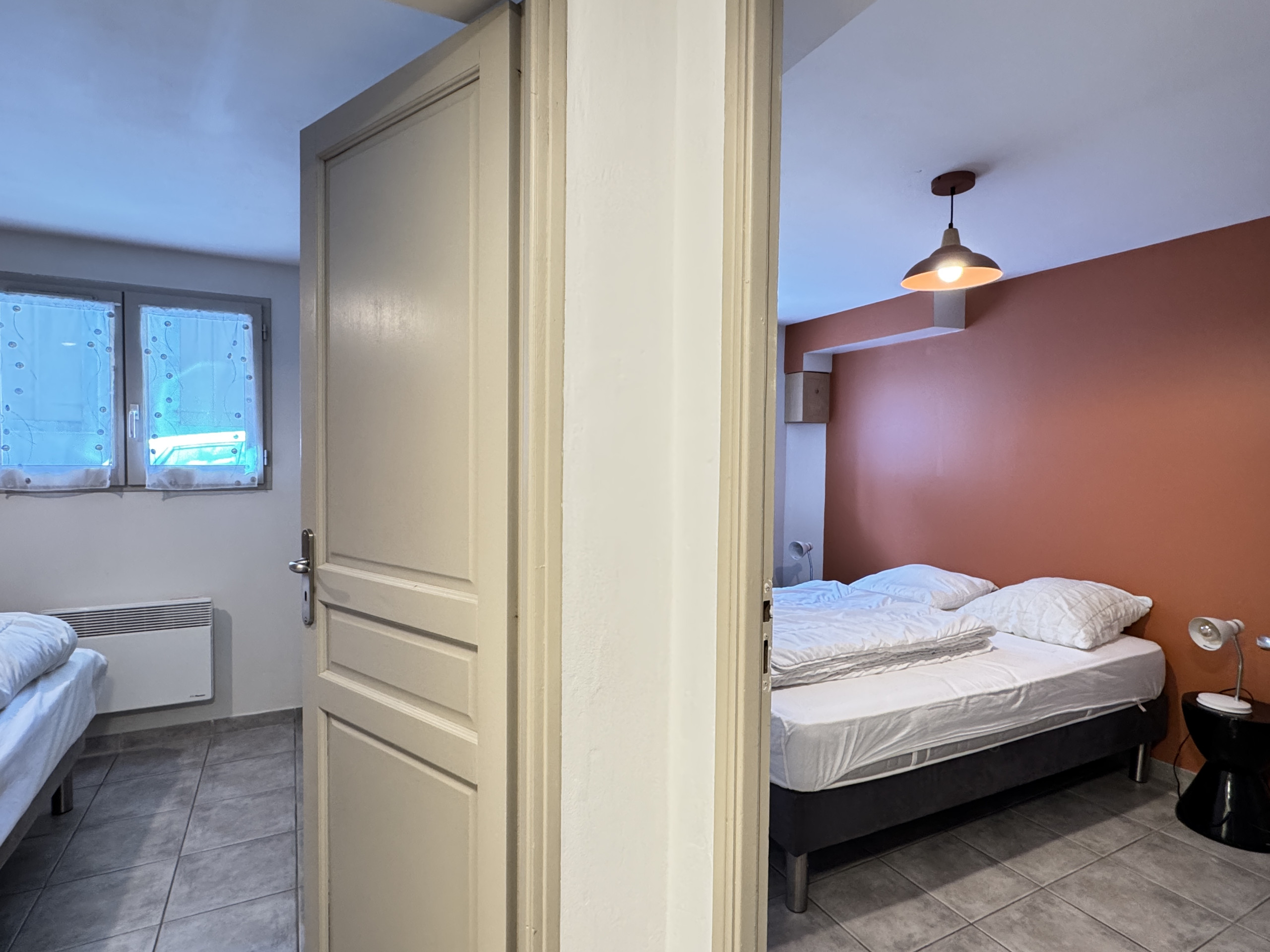 Once inside, the large living room has an 8-person dining table, 2 sofas; a fitted kitchen with gas hob, fridge-freezer, built-in oven and microwave, dishwasher, filter and Senséo coffee maker, toaster, kettle, raclette machine.