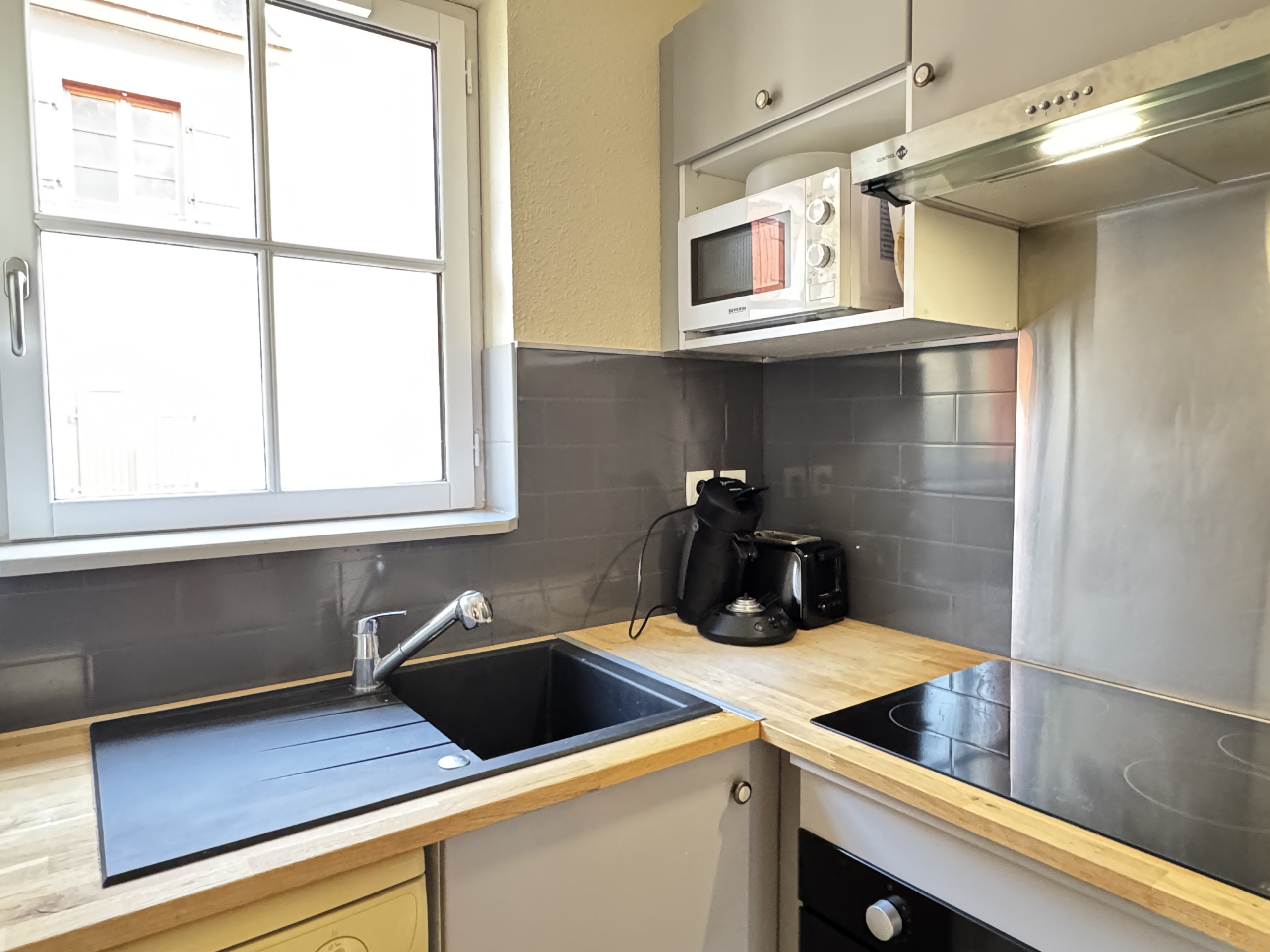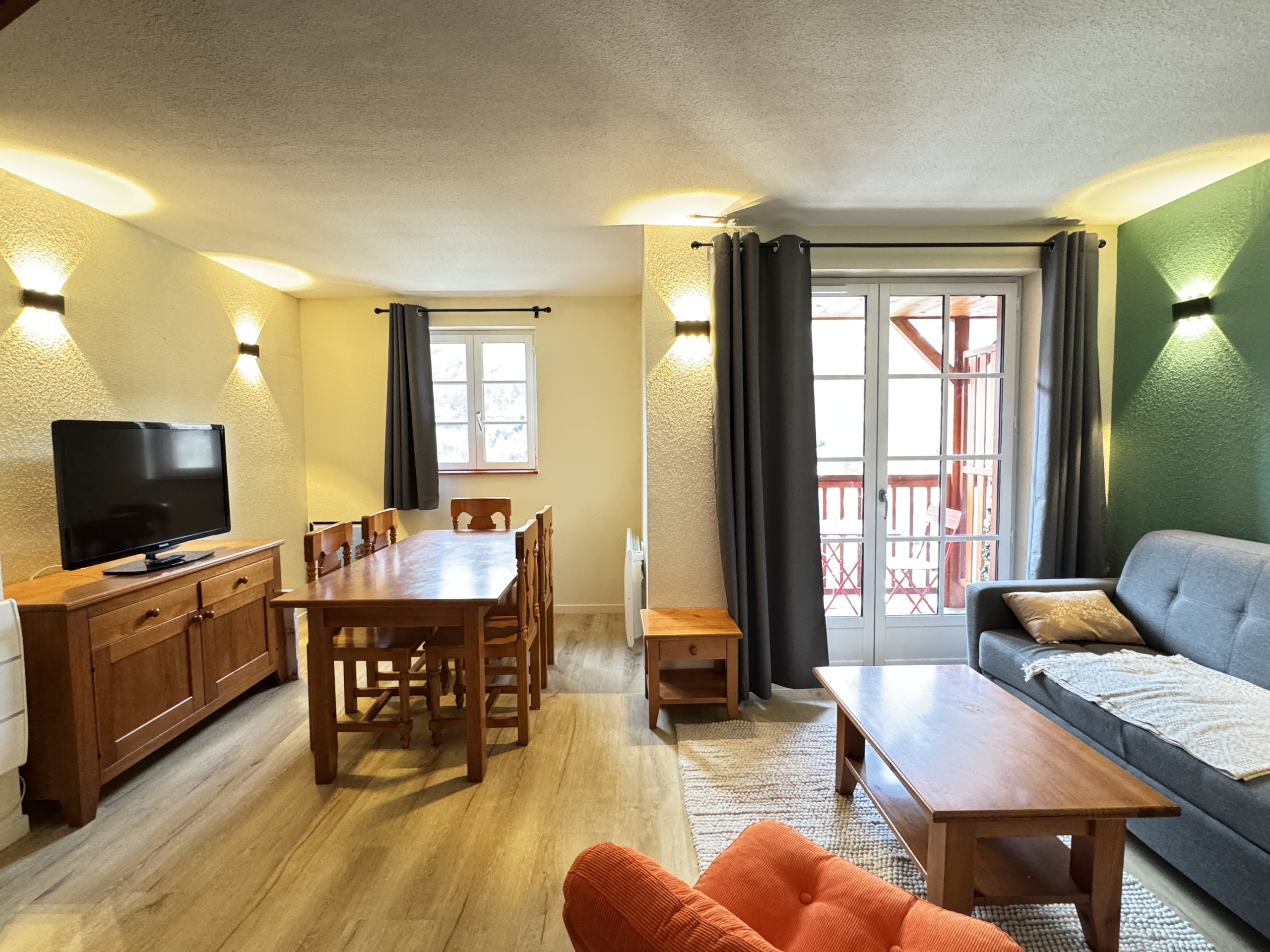 Pieza de vida con kitchenette equipada (refrigerador-congelador, placas vitro, lavavajillas, horno tradicional y microondas, cafetera de filtro y Senséo, hervidor, tostadora, raclette), mesa para 6 personas, rincón de salón con sofá cama y pantalla de TV. Balcón orientado al Oeste con muy bonita vista a la montaña. Aseo separado.