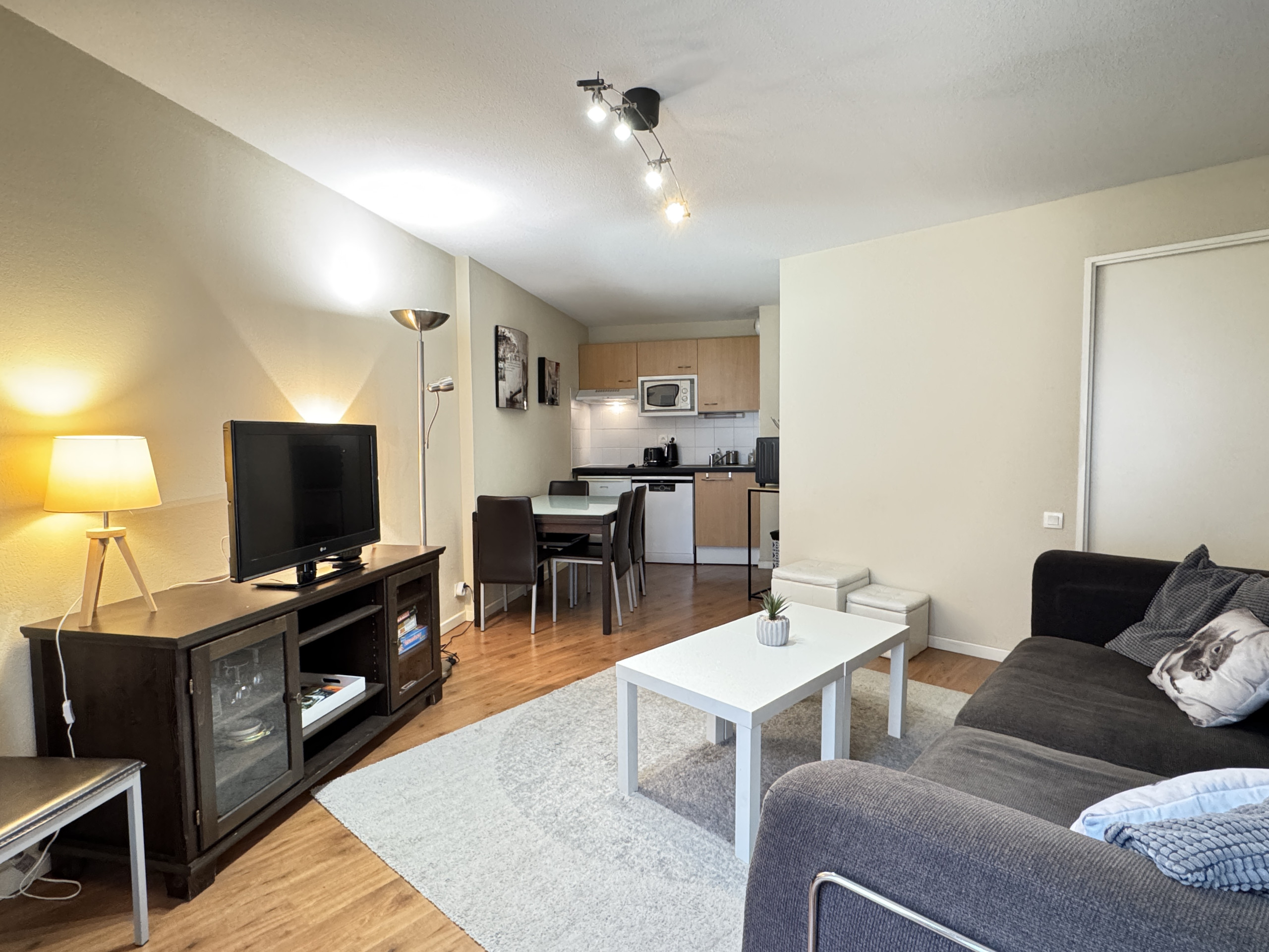 Un salón con cocina americana equipada (vitrocerámica, frigorífico superior, lavavajillas, microondas, mini horno, cafetera de filtro y Nespresso, hervidor, tostadora, parrilla raclette). Comedor. Sofá y pantalla de TV.